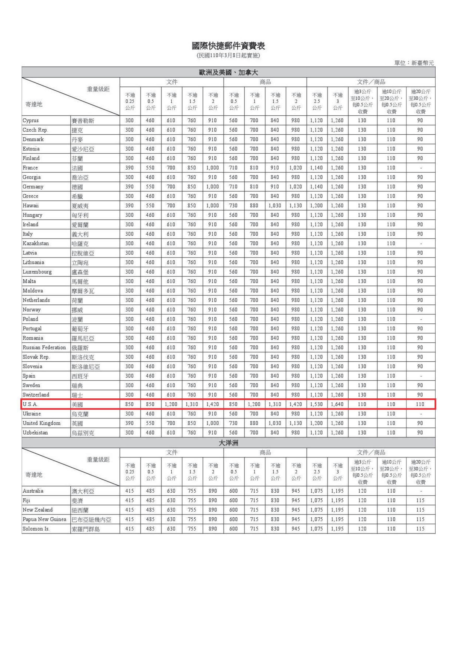 從2021年3月8日起,中華郵政調漲國際郵件寄送費用。